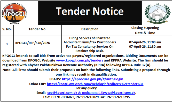 Services of Tax Consultancy Services On Retainer ship Basis Services of Tax Consultancy Services On Retainership Basis By Admin|2026-03-18T12:56:51+05:00March 18th, 2026|Uncategorized| Related Posts DRINKING MINERAL WATER FOKPOGCL UNDER FRAMEWORK CONTRACT DRINKING MINERAL WATER FOKPOGCL UNDER FRAMEWORK CONTRACT ASSET DISPOSAL NOTICE ASSET DISPOSAL NOTICE KPOGCL-Tender for Hiring Statutory Audit Services for FY-2024-25 KPOGCL-Tender for Hiring Statutory Audit Services for FY-2024-25 Tender Notice for Tender No 570 Drinking Mineral Water under Framework contract Tender Notice for Tender No 570 Drinking Mineral Water under Framework contract KPOGCL Procurement Of Open Source Enterprise Resource Planning (ERP) Solution KPOGCL Procurement Of Open Source Enterprise Resource Planning (ERP) Solution